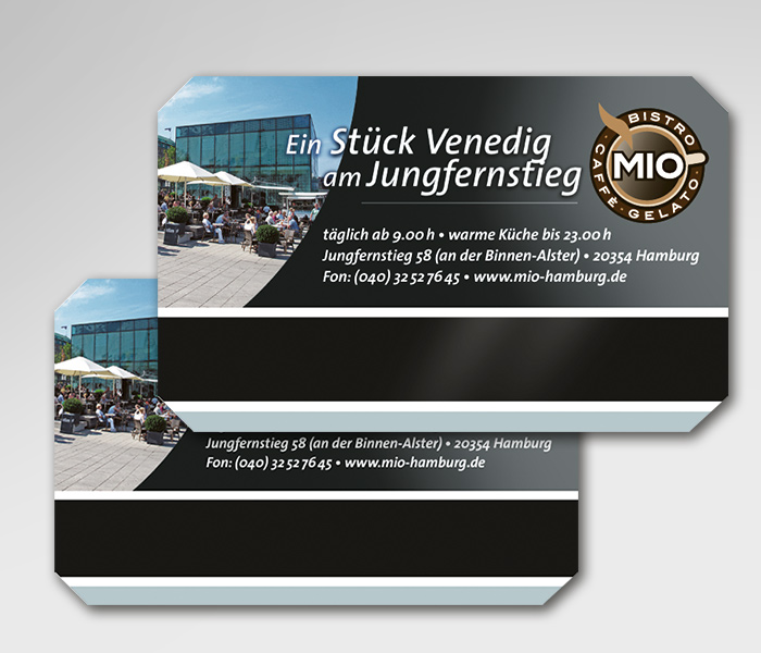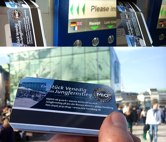 Ein echter Hingucker sind die aufwändig gestalteten Parktickets im Parkhaus der Europapassage. Da diese Parkmöglichkeit nur einen Steinwurf vom MIO entfernt liegt, bekommt der Kunde nicht nur einen erstklassigen Parkplatz, sondern auch gleich eine Einladung zu einem »echten Stück Venedig am Jungfernstieg«.