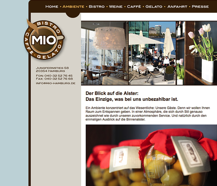 Unsere Aufgabe: Den Menschen in Hamburg zu zeigen, dass hier auch die »inneren Werte«, das heißt, das gastronomische Angebot und der Service stimmen. Und dazu haben wir eine Brücke geschlagen zwischen der modernen Architektur und der typisch italienischen Herzlichkeit im MIO. Umgesetzt wurde dieser Gedanke zuerst in einem Markenkonzept und neuen Texten für den Internet-Auftritt.